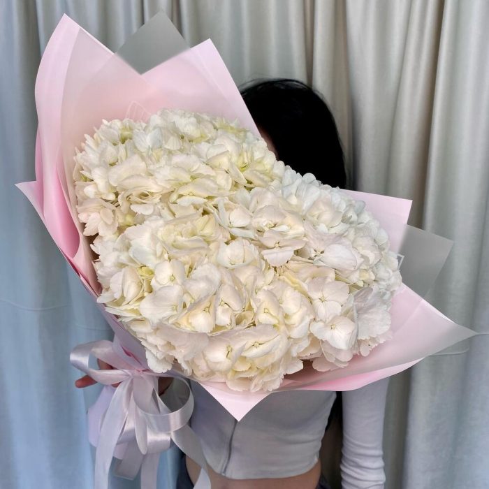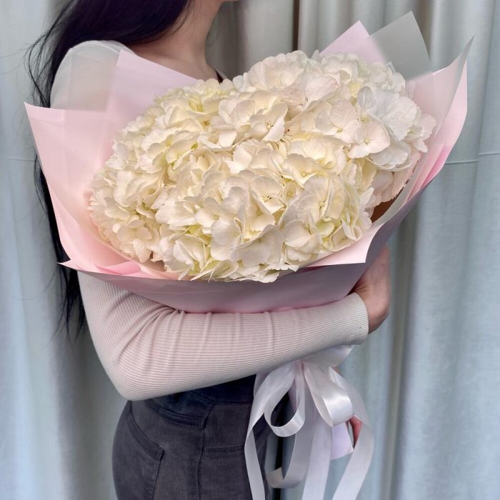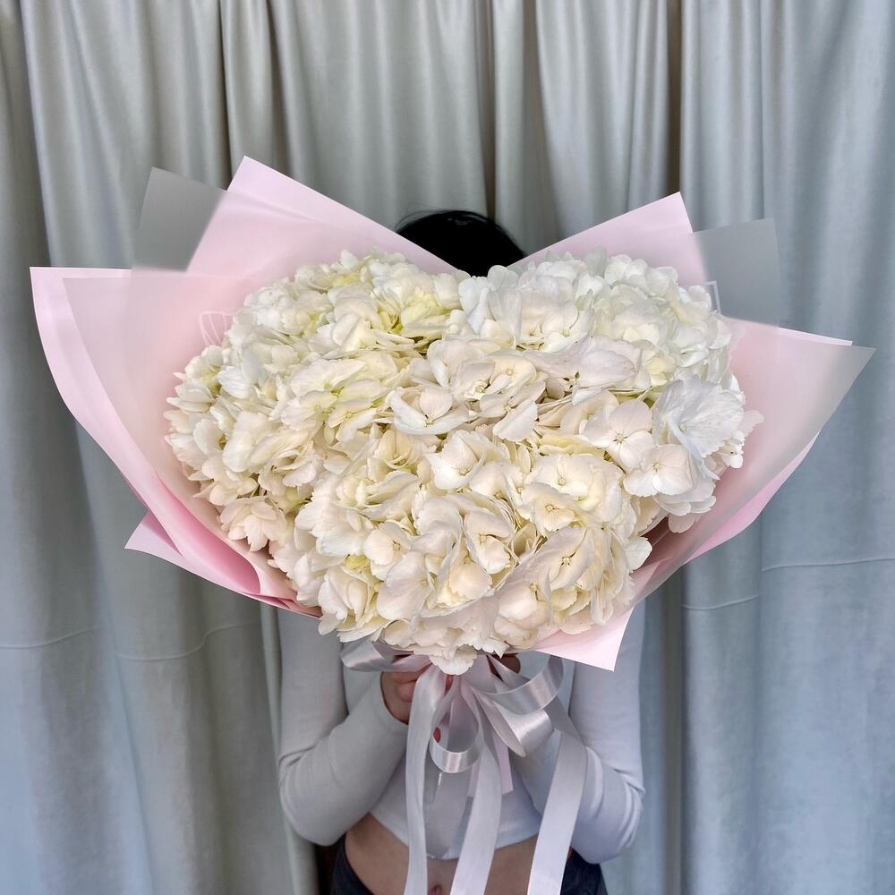 Гортензия – 3 шт.Лента атласная – 2 шт.Пленка дизайнерская – 3 шт.открытка с вашими пожеланиями – 1 шт.